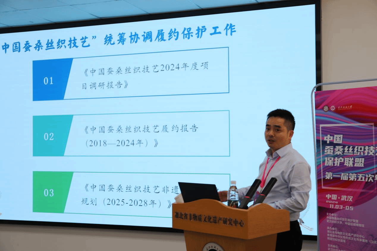2024年11月3日至5日,中国蚕桑丝织技艺保护联盟第一届第五次年会在武汉纺织大学非遗中心隆重召开。年会由中国蚕桑丝织技艺保护联盟、武汉纺织大学、中国丝绸博物馆联合主办,湖北省非物质文化遗产研究中心、教育部中华优秀传统文化传承基地(汉绣)以及荆楚纺织非遗馆承办。武汉纺织大学副校长傅欣、中国丝绸博物馆馆长季晓芬出席会议,武汉市江汉区非遗保护中心、武汉市民间文艺家协会、武汉纺织大学科发院、博彩投注