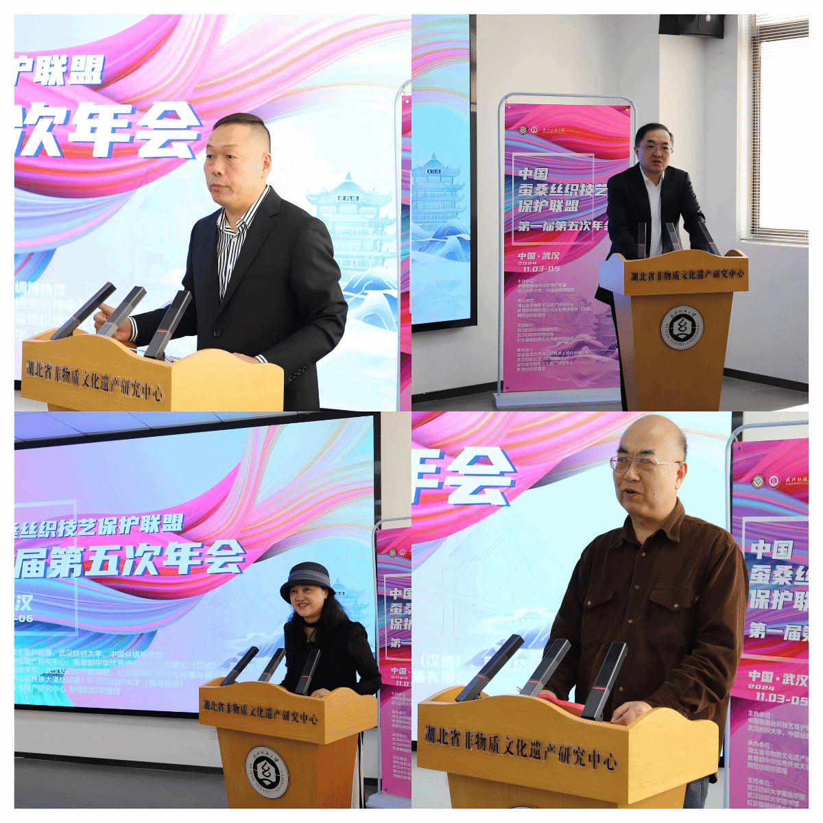 今年中国蚕桑丝织技艺保护联盟由武汉纺织大学担任轮值主席。11月4日上午,开幕式由非遗研究中心主任叶洪光教授主持。武汉纺织大学副校长傅欣、武汉市民间文艺家协会主席王建军以及中国丝绸博物馆馆长季晓芬分别致辞。