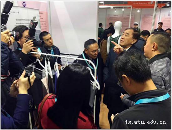 展位现场,中国纺织工业联合会原会长王天凯、副会长徐迎新,中国纺织服装教育学会会长倪阳生等有关领导出席现场,并与我院贾琦教授进行了深入交流,几位领导对我院参展产品的设计、工艺流程及色彩搭配等各个方面都给予了高度关注和肯定。