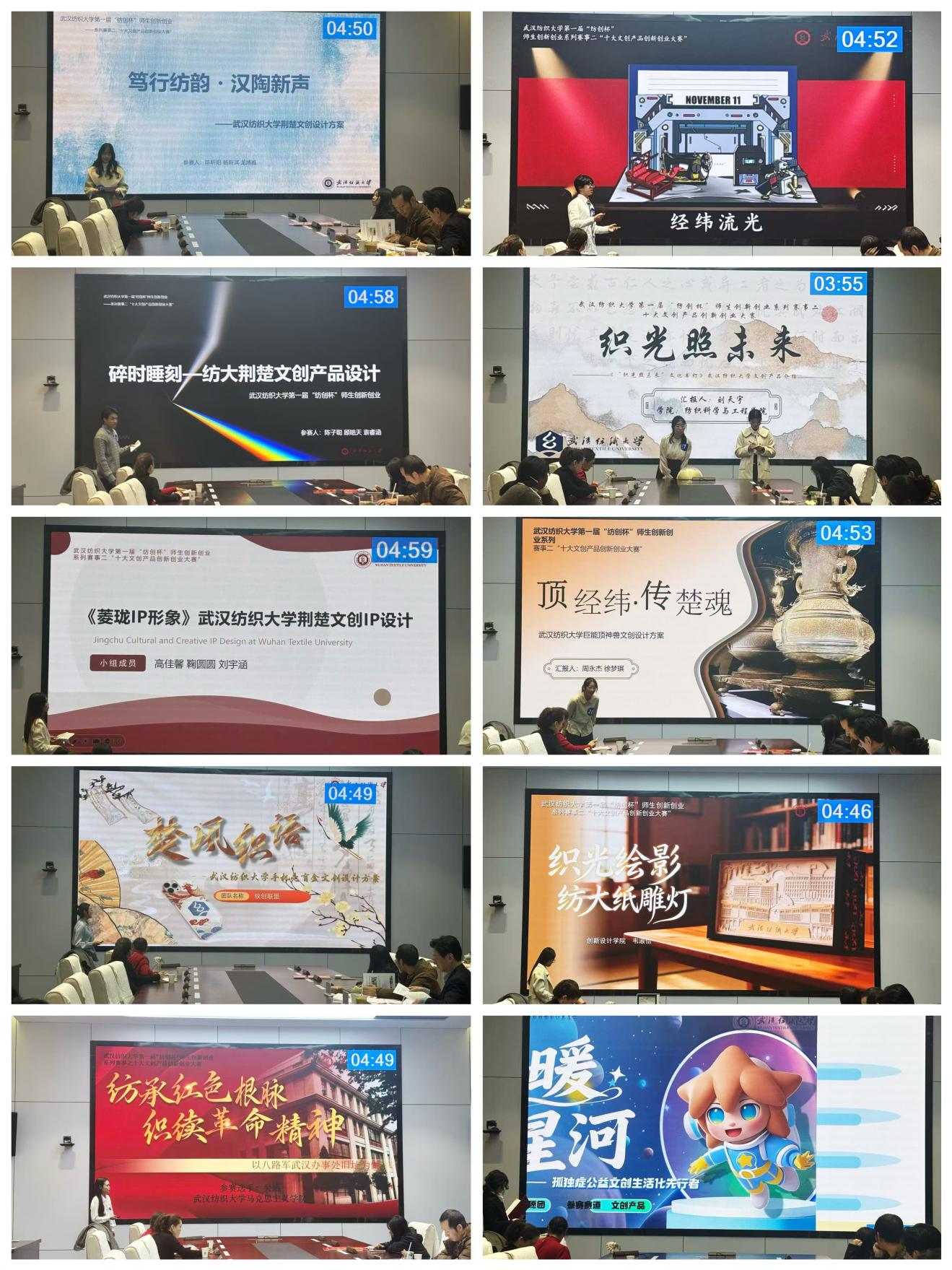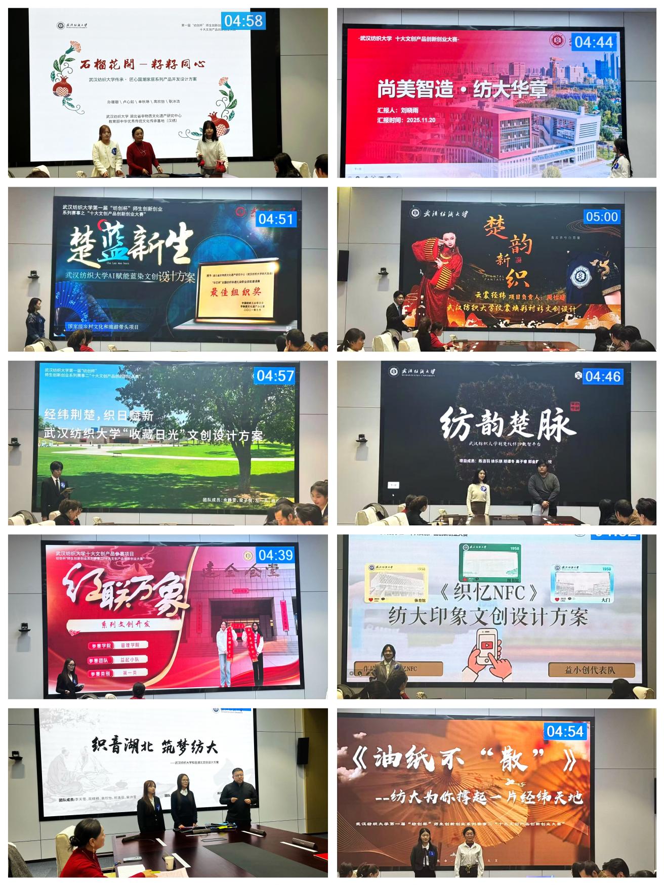 承办。作为本次“纺创杯”系列赛之一的“十大文创产品创新创业大赛”开始于九月初,全校10余个学院,涵盖五大学部的师生积极备赛,经过近三个月的筹备,先后近100项作品通过初选;经外审专家盲评,共有20项十大文创作品、4项创新创业学院logo设计作品进入决赛。武汉创意产业协会常务副会长张敏教授、武汉理工大学杜娟教授和江汉大学马杰教授担任此次比赛终评评审。90余名项目组师生代表参加了此次活动。