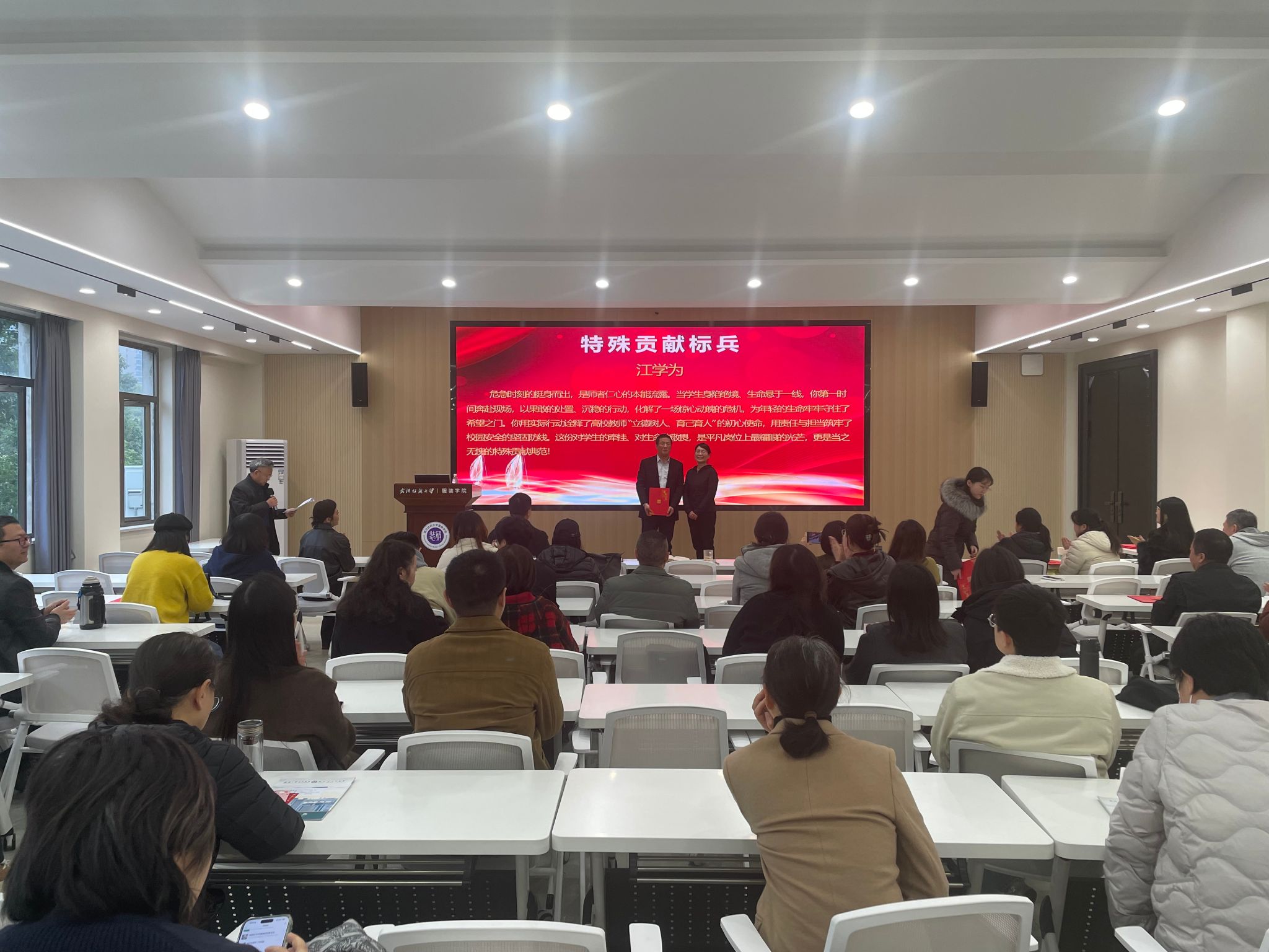 随后,学院对2025年度科研标兵、教学标兵、服务标兵和特殊贡献标兵进行了表彰。学院党委书记杜新年和院长陶辉为获奖教职工颁奖,勉励全体教职工以标兵为榜样,锐意进取、争先创优,在各自岗位上再创佳绩。