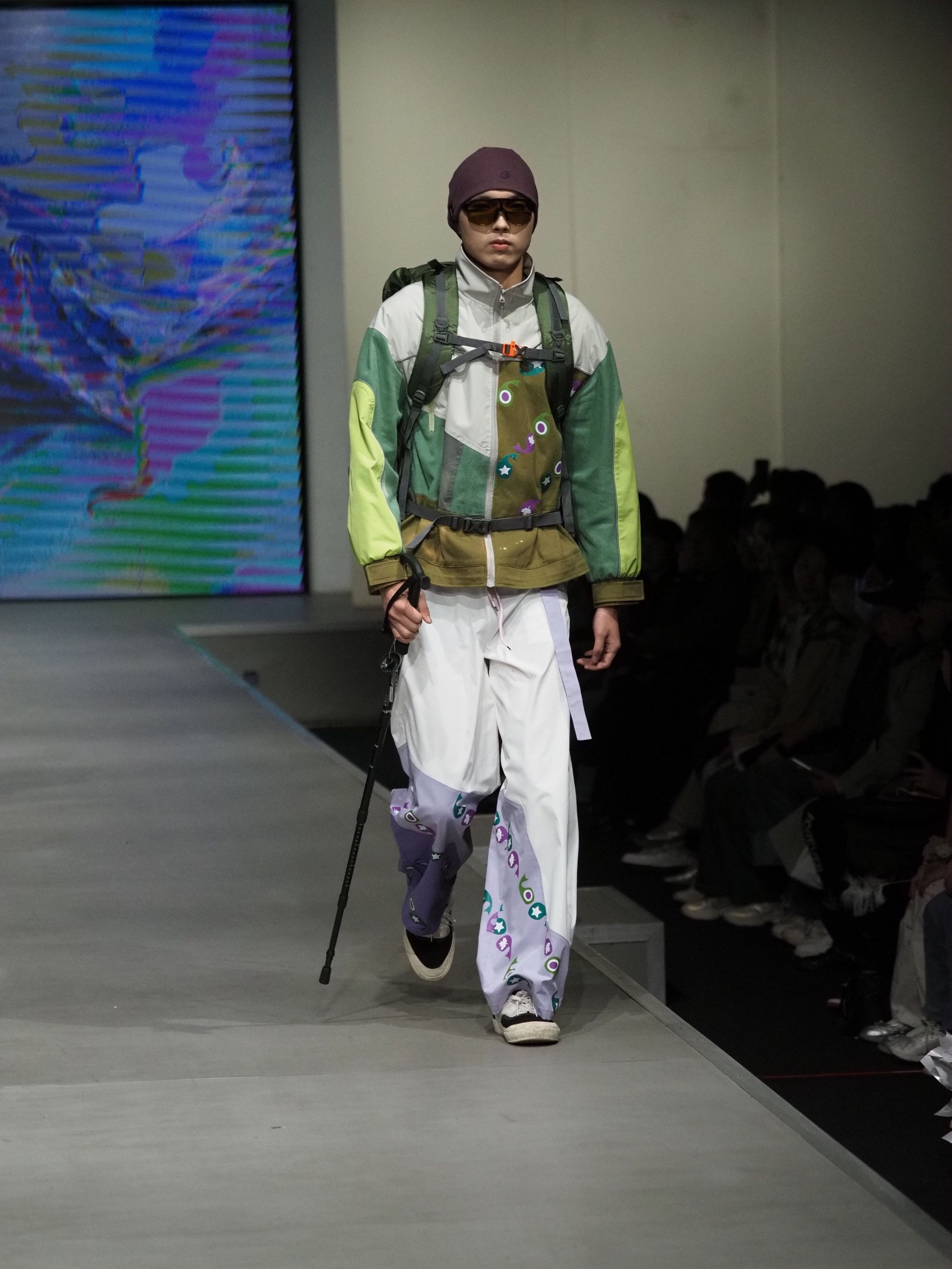 可持续理念则驱动了从设计源头到使用终端的全链条创新。服设(中外)12201班许昕怡的作品《会飞的帽子》,通过巧妙的可拆卸与多功能转换设计,使服装部件能重组成背包或帽子,践行“一衣多穿”。服设12201班冯馨柔在《找自己》系列中,坚持全天然面料与科学剪裁以减少浪费,并辅以AI创作的动态影像,完整诠释了“环保即科技”的深刻内涵。