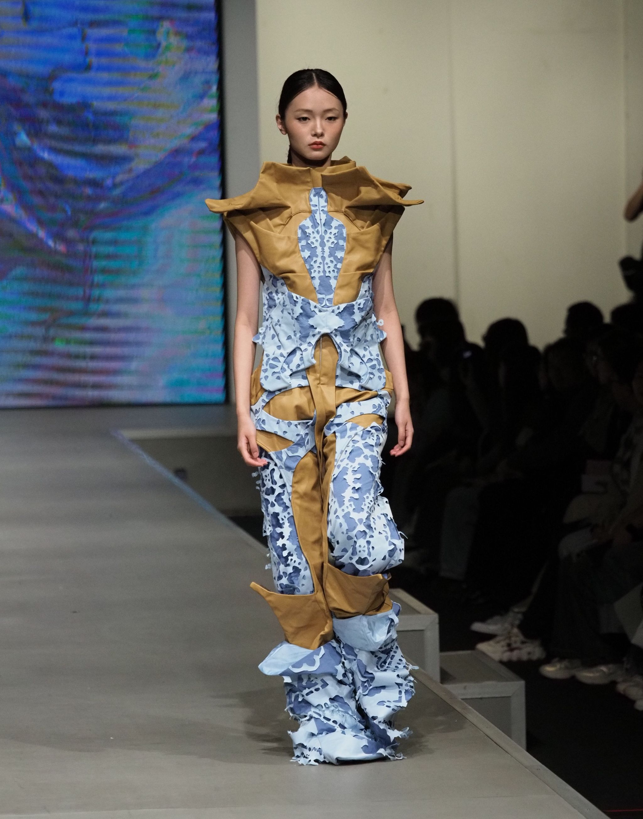 在数字智能穿戴领域,设计已超越视觉,成为可交互的情感载体。服设12202班黄锐的作品从解构主义建筑与AI创业精神中汲取灵感,将建筑流动的曲面转化为嵌入柔性电子的织料,使其能随身体数据生成动态光影,肩部由算法生成的修补裂痕则记录了创作历程,让服装成为一件“可穿戴的思维外骨骼”。