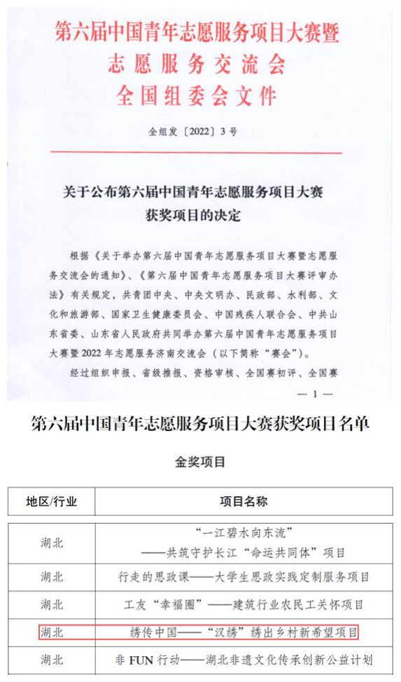 (“绣传中国——‘汉绣’绣出乡村新希望项目”获第六届中国青年志愿服务项目大赛金奖)