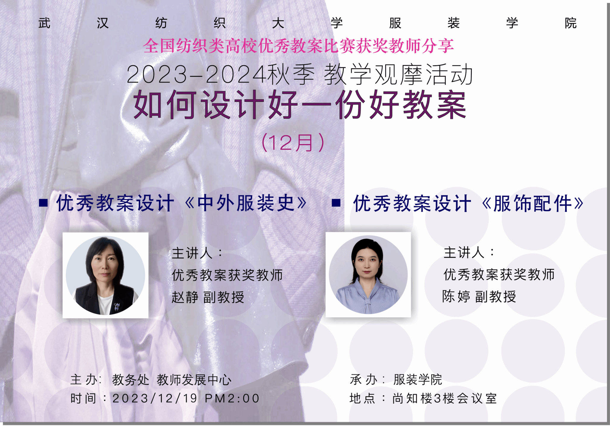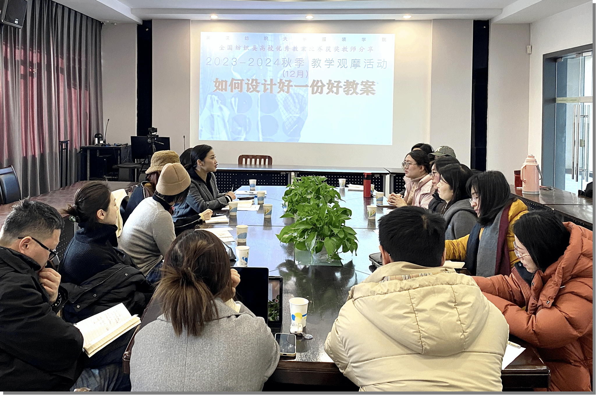 承办的教学观摩活动在南湖尚知楼3楼会议室举行。参加教学分享的是在全国纺织类高校优秀教案比赛中获奖的赵静副教授和陈婷副教授。此次教学观摩活动由教学副院长钟蔚主持。