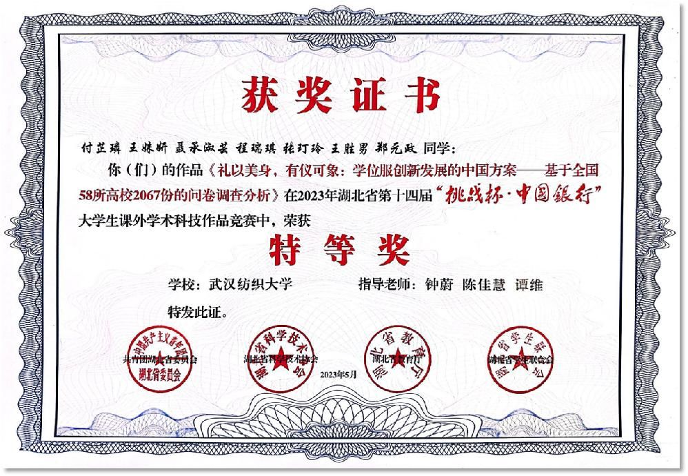 (付芷璘等同学的团队获湖北省第十四届 “挑战杯”大学生课外学术科技作品竞赛特等奖)