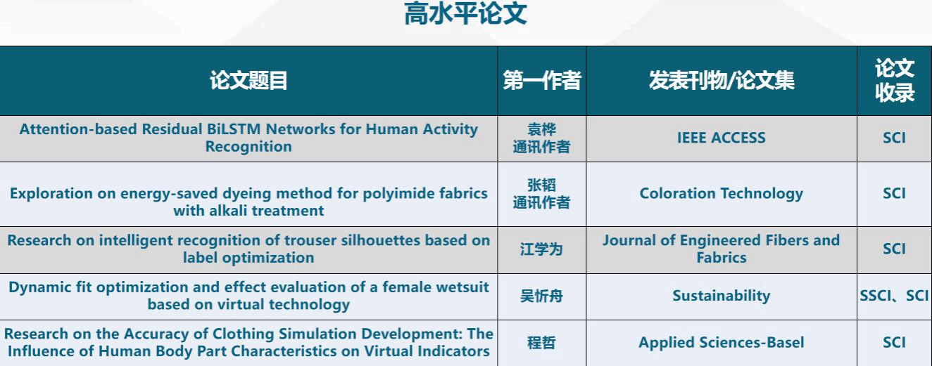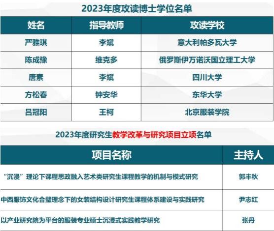 2023届研究生考取博士人数5人,超额完成学校下达3人的任务。《时尚与可持续发展设计实践》获全国艺术专业学位研究生指导委员会在线示范课程立项。获批校级精品课程3项、教改项目3项,创新基金8项。学院新增“材料与化工”二级学科方向:服装数字化技术。学院强化导师毕业论文指导管理,提升毕业论文质量,论文盲审双优2人,单优率28.2%,单优率较2022年提升 9%,研究生培养质量稳步提升。学院重视专业硕士实践能力培养,研三学生卓冬冬荣获湖北省首届文化产业创新创意设计大赛一等奖,被湖北卫视湖北新闻报道;研究生周梦获湖北省大学生自强之星、中国大学生自强之星奖学金,研究生吴增获中国服装设计师协会主办的“泽塔云”杯第一届中国元宇宙服装设计大赛金奖,吴增等研究生获工业和信息化部工业文化发展中心与中国服装设计师协会主办的首届“洪合杯”毛衫设计大赛银奖,研究生张灿灿获中国纺织服装教育学会举办的第一届“海阳杯”毛衫设计大赛金奖。
