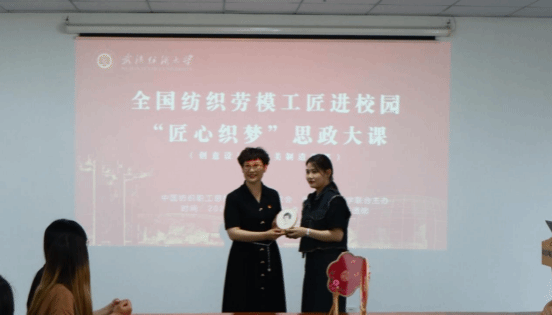 学生代表还亲手送上汉绣非遗技艺制作的作品,希望工作室的建立,成为同学们与榜样链结的桥梁,成为广大服装学子与劳模对话和学习的平台。