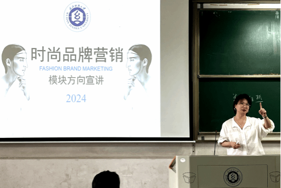 在时尚品牌营销方向宣讲环节,周奕老师从时尚行业认知、专业方向认知、就业前景认知等单个方面,详细地介绍了“时尚品牌营销”课程模块的服装市场营销、 数字化运营、 时尚视频拍摄及制作等主干课程的内在关系,及先修课程之间的逻辑脉络,对该方向的未来职业素养要求和培养路径进行了深入浅出又不失幽默的讲解。