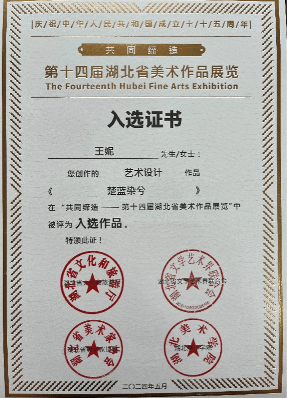 王妮副教授设计的非遗蓝染服装作品《楚蓝染兮》获评入选作品。本届美展全省入选的服装设计参展作品仅有四套,从作品立意到创作表达选拔都十分严格。王妮副教授此次能够入选,也是多年在非遗蓝染创新设计领域深耕的成果。