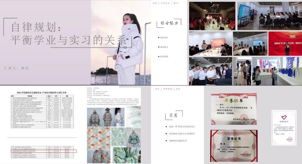 杨佳在本次衣问论坛的主题为《自律规划:平衡学业与实习的关系》。主要围绕:通过自身在实习期间如何处理好学业为例进行分享,通过提前规划、认真对待来完成实习中的工作,以及结合实习方向与学业内容来达到实习反哺学业的相辅相成,在此期间充分利用平台提升自我技能和综合能力,取得了专利、作品、荣誉等丰富的成果。