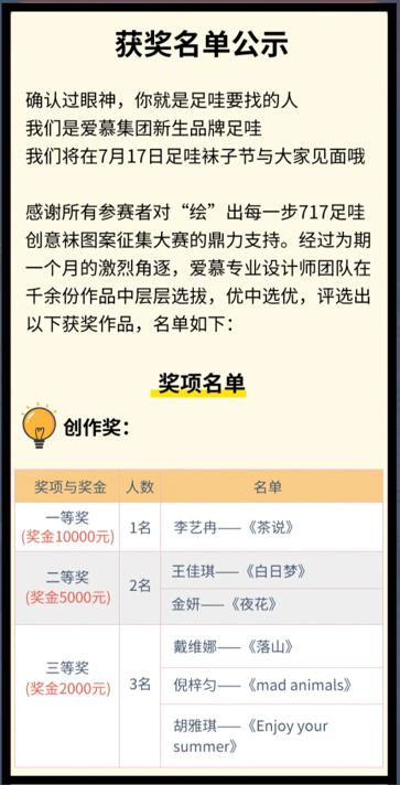 6月28日,爱慕集团“绘”出每一步717足哇创意袜图案征集大赛公示获奖名单,博彩投注