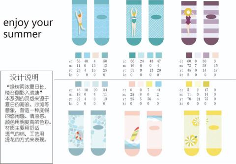 胡雅琪同学的作品《Enjoy your summer》灵感来源于夏日的海浪,沙滩等意向,“绿树阴浓夏日长,楼台倒影入池塘”,胡雅琪同学用这次的作品想要营造一种度假的悠闲感和清凉感。