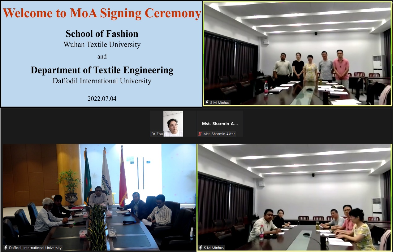 On July 4, 2022, a Memorandum of Agreement (MoA) signing ceremony was held in the conference room on the third floor of the School of Fashion. The meeting was conducted by online video conference. Prof. Tao Hui, Dean of the School of Fashion, also the relevant faculty members of the School of Fashion and School of International Education, as well as the delegates from Daffodil International University were participated. The both sides conducted preliminary communication on curriculum development, student exchange, dual university program, faculty exchange, cross-cultural research project and the development of sustainable education systems among One Belt One Road countries.